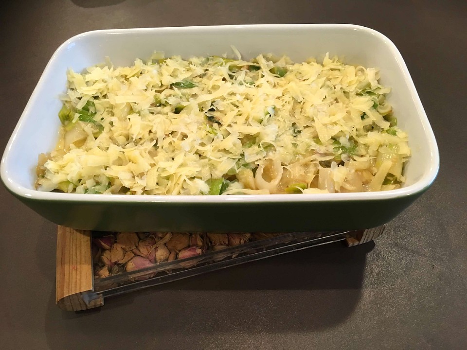 - Mix and transfer into earthenware/baking dish so that leeks are about 1 inch thick. Sprinkle the other half of cheese on the top and bake for 20 minutes.